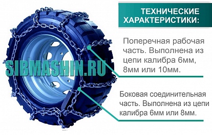 Цепи противоскольжения для погрузчиков и спецтехники тип «сота» изготавливаются из круглозвенной цепи калибрами 6/6мм, 8/8мм, 10/10мм (где первая цифра — калибр поперечной рабочей части цепи, вторая цифра — калибр боковой соединительной части цепи).